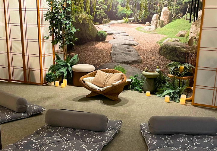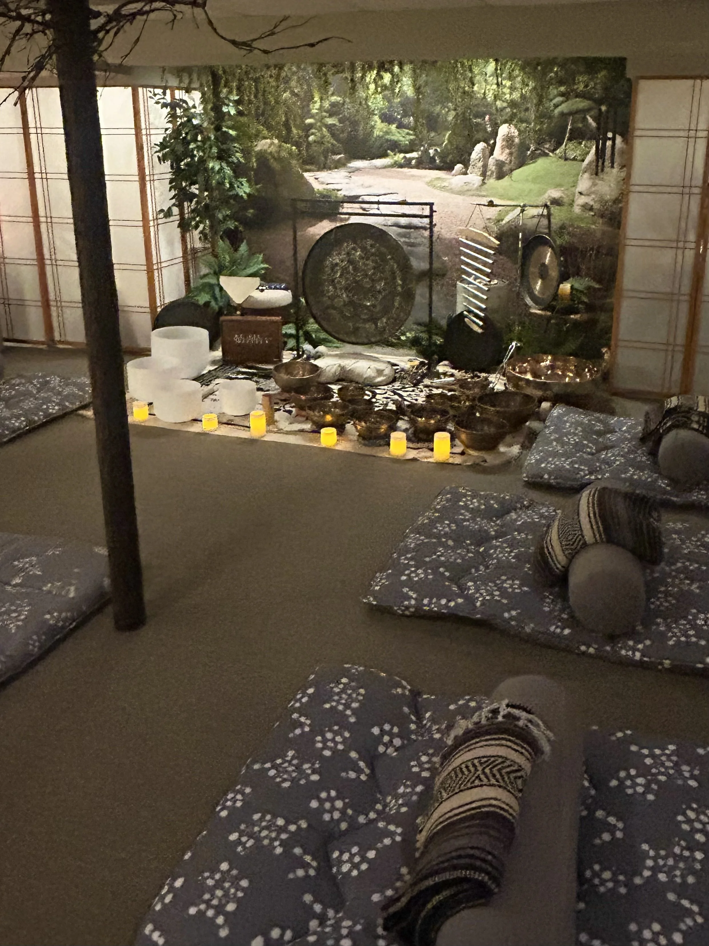 This tranquil space is suited to meditation, sound healing, breathwork, and low-movement restorative yoga practices. Other seated or reclined group classes and workshops can also be held here. The space comfortably holds 10 people for reclining practices and 16 for seated classes/workshops. Meditation cushions, futon mats, yoga mats, bolsters, blocks, blankets, and straps are available. A HEPA filter is available for use in-room. The room has dimmable lights and is wired into the center’s ambient music system with an individual control for volume.